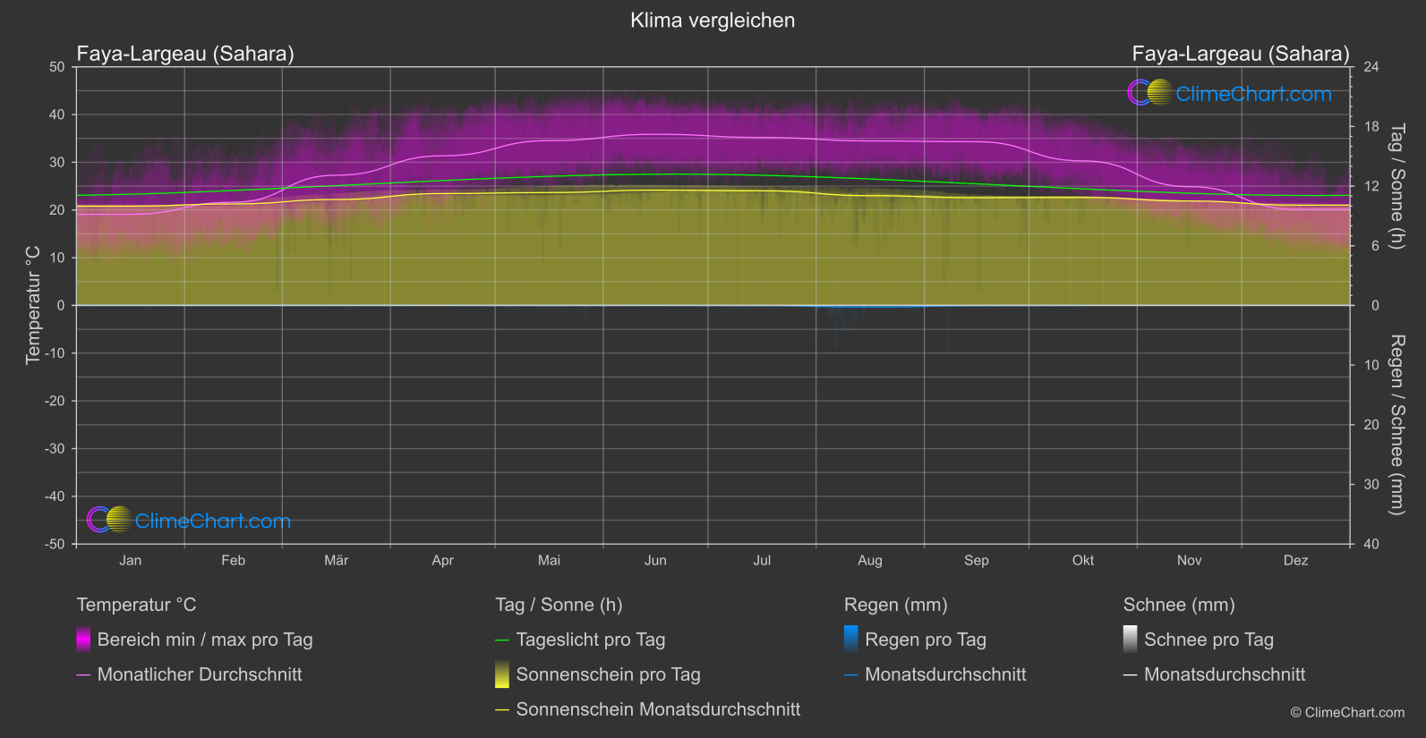Umfassendes Klimavergleichs-Diagramm von Faya-Largeau (Sahara), Tschad mit Paris, Frankreich: Monatliche Durchschnitte und Auswirkungen