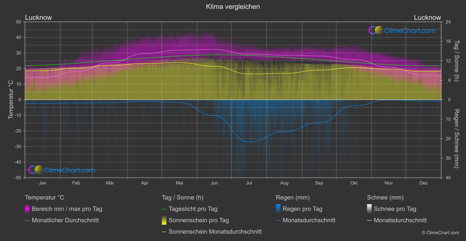 Klimavergleich Datenübersicht für Lucknow, Indien mit Paris, Frankreich