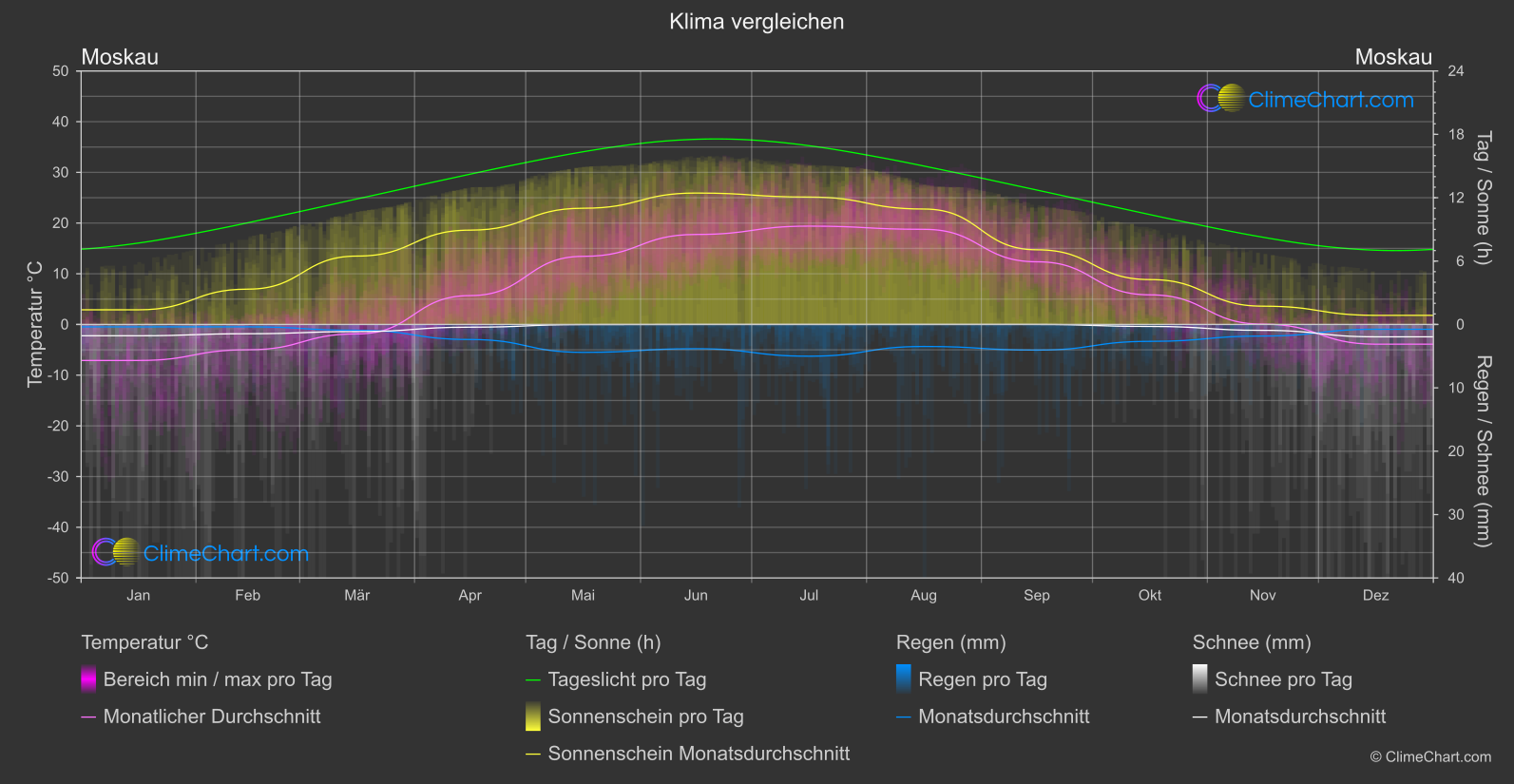 Umfassendes Klimavergleichs-Diagramm von Moskau, Russische Föderation mit London, Großbritannien: Monatliche Durchschnitte und Auswirkungen