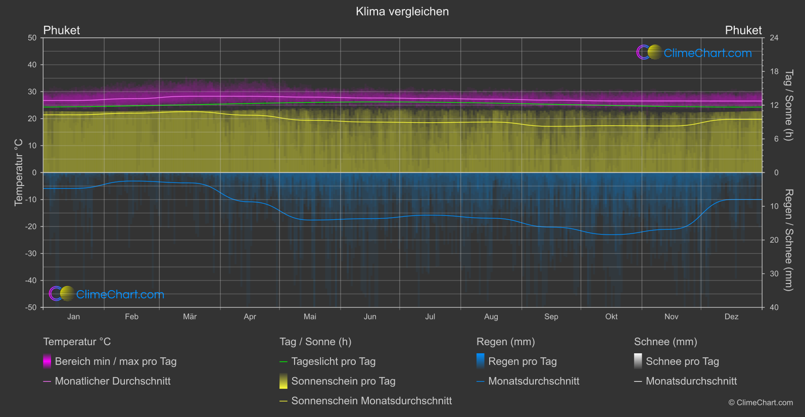 Willkommen bei unserem Klimavergleichstool, mit dem Sie die Wetterbedingungen von Phuket, Thailand und Marrakesch, Marokko erkunden und vergleichen können. Unsere umfassenden Diagramme bieten detaillierte Einblicke in Temperaturschwankungen, Niederschlagsmengen und saisonale Veränderungen im Laufe des Jahres. Ob Sie eine Reise planen oder einfach nur neugierig auf das Klima sind, unser Tool hilft Ihnen, die einzigartigen Wetterbedingungen dieser Orte zu verstehen. Entdecken Sie die beste Reisezeit für Phuket und Marrakesch und treffen Sie fundierte Reiseentscheidungen auf Basis genauer Klimadaten.