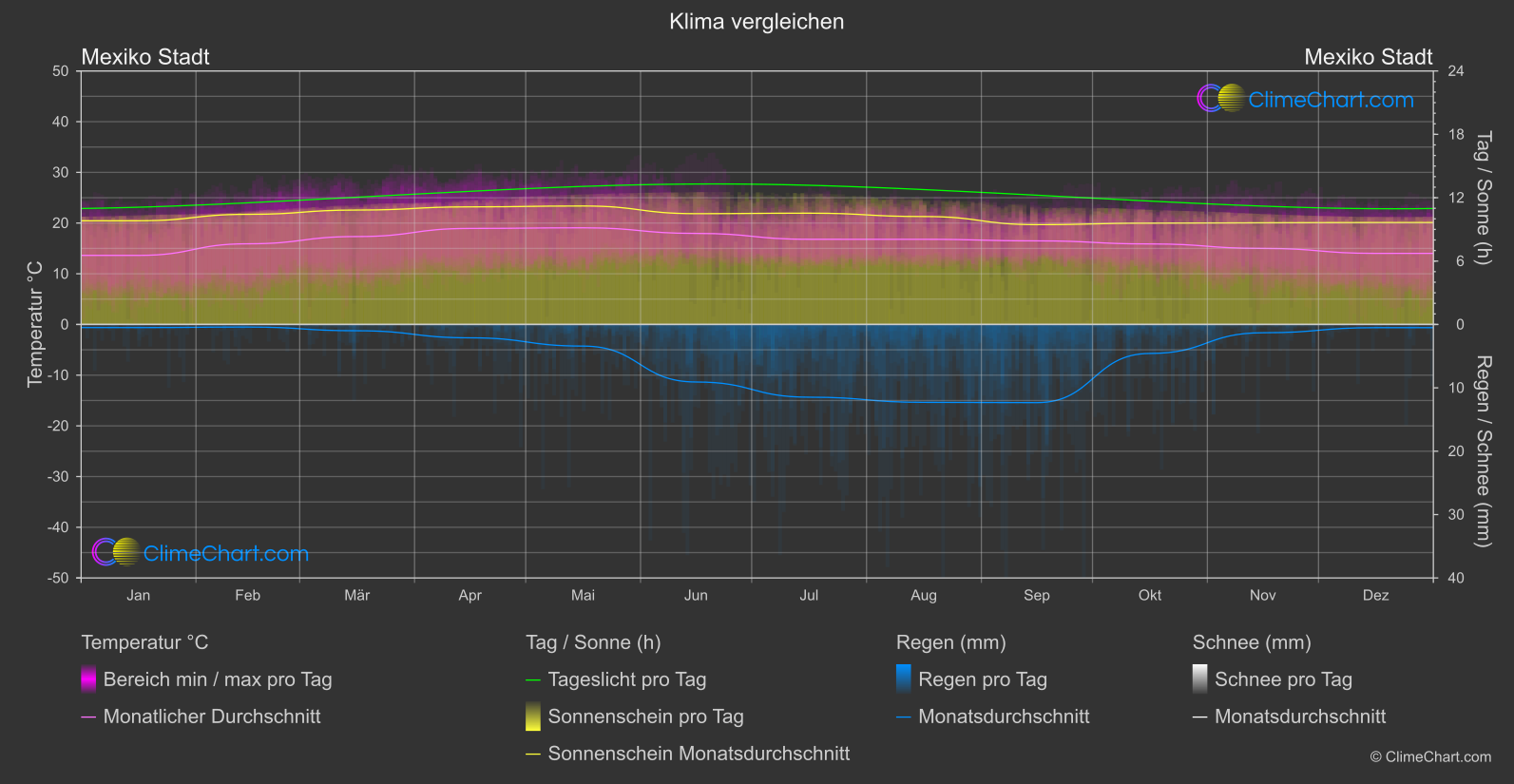 Umfassendes Klimavergleichs-Diagramm von Road Town, Virgin Inseln, Britisch) mit Mexiko Stadt, Mexiko: Monatliche Durchschnitte und Auswirkungen