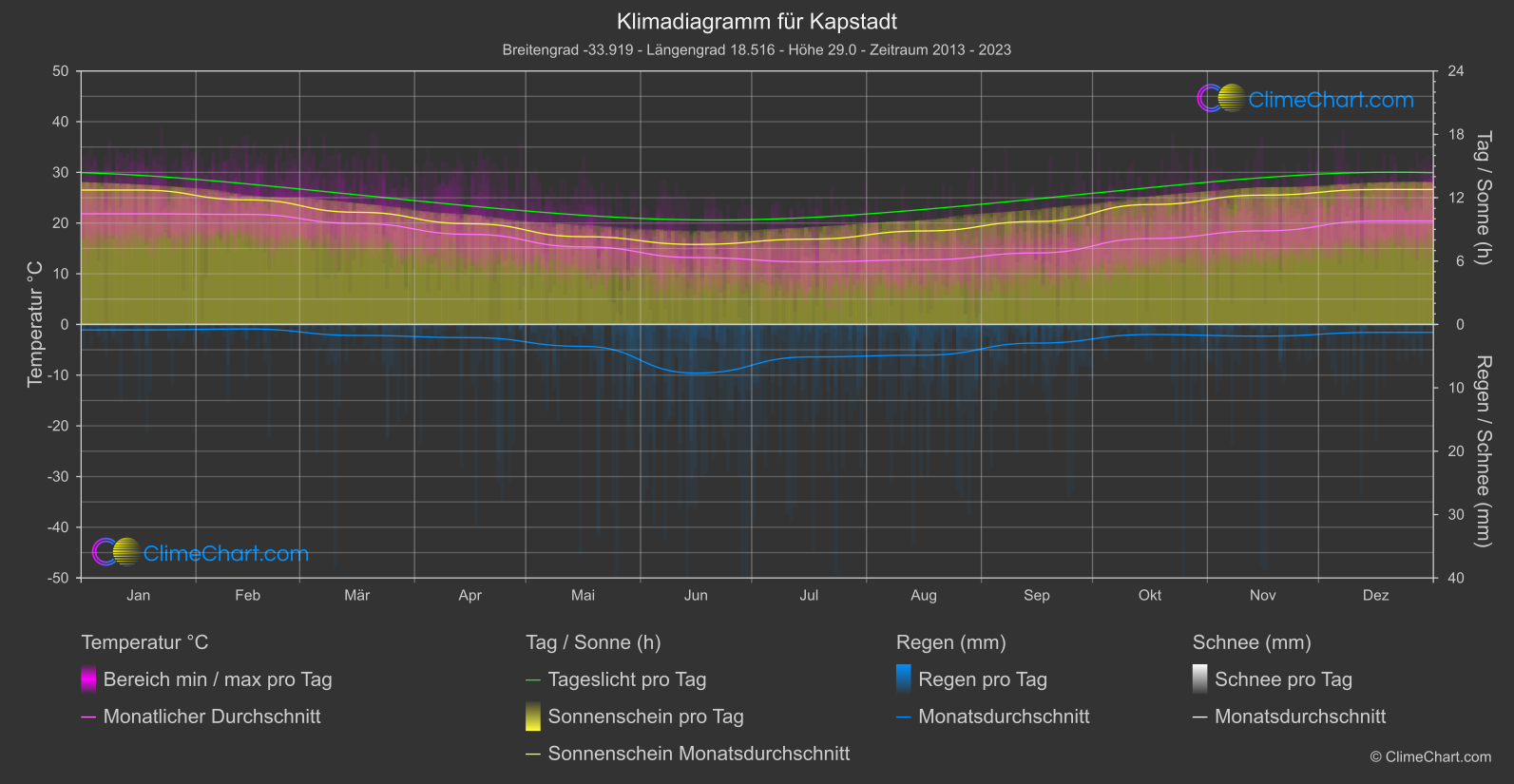 Umfassendes Klimadiagramm von Kapstadt, Südafrika: Monatliche Durchschnitte und Wettertrends