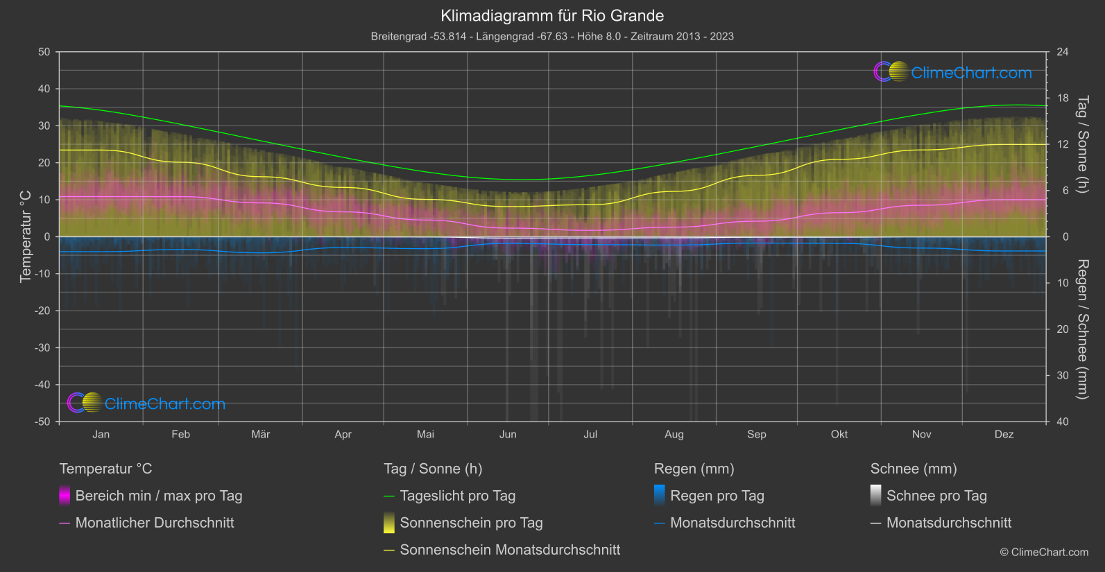 Umfassendes Klimadiagramm von Rio Grande, Argentinien: Monatliche Durchschnitte und Wettertrends