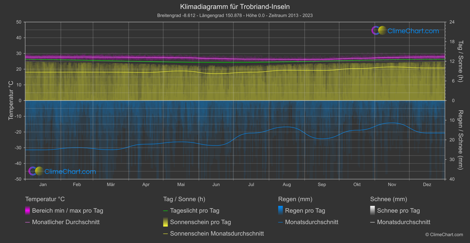 Die Trobriand-Inseln in Papua-Neuguinea haben ein tropisches Regenwaldklima mit hoher Luftfeuchtigkeit und signifikanten Niederschlägen das ganze Jahr über.