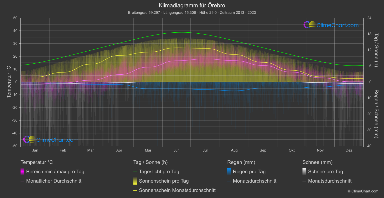 Örebro liegt in Zentralschweden und hat ein gemäßigtes Klima mit vier deutlich ausgeprägten Jahreszeiten.