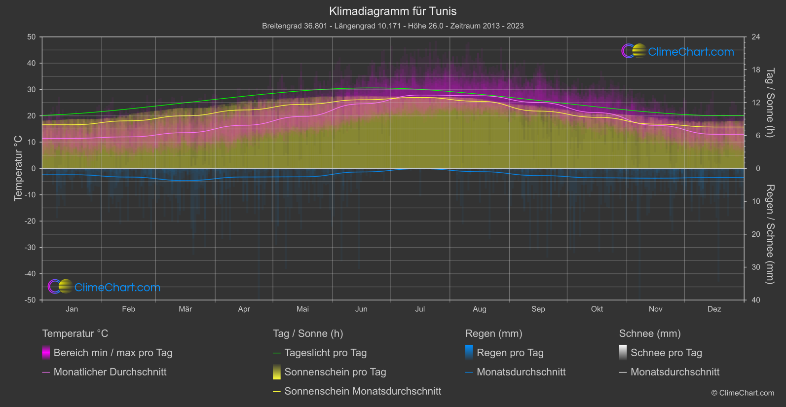 Tunis, die Hauptstadt Tunesiens, hat ein mediterranes Klima mit heißen, trockenen Sommern und milden, feuchten Wintern.