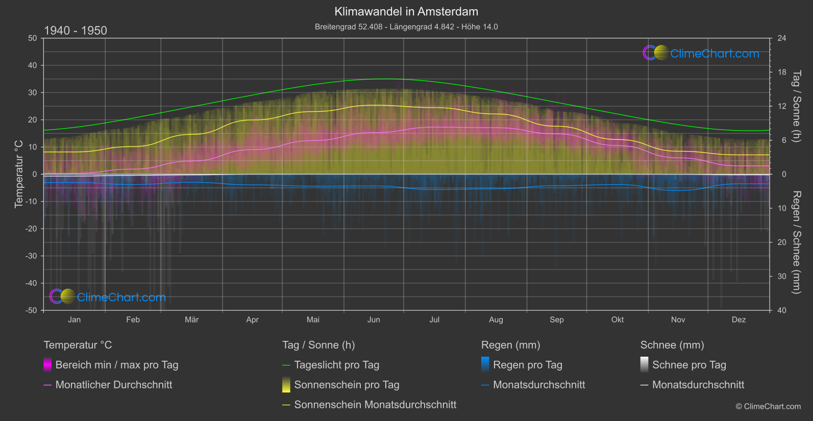 Umfassendes Klimawandel-Diagramm von Amsterdam, Niederlande: Monatliche Durchschnitte und Auswirkungen