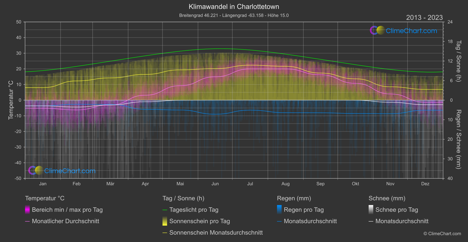 Umfassendes Klimawandel-Diagramm von Charlottetown, Kanada: Monatliche Durchschnitte und Auswirkungen