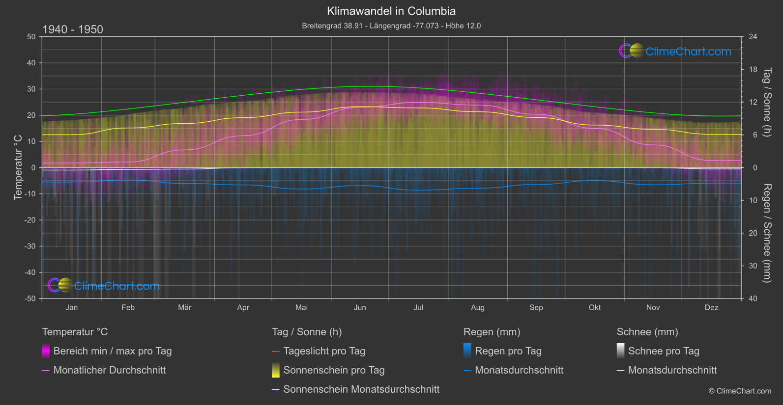 Umfassendes Klimawandel-Diagramm von Columbia, USA: Monatliche Durchschnitte und Auswirkungen