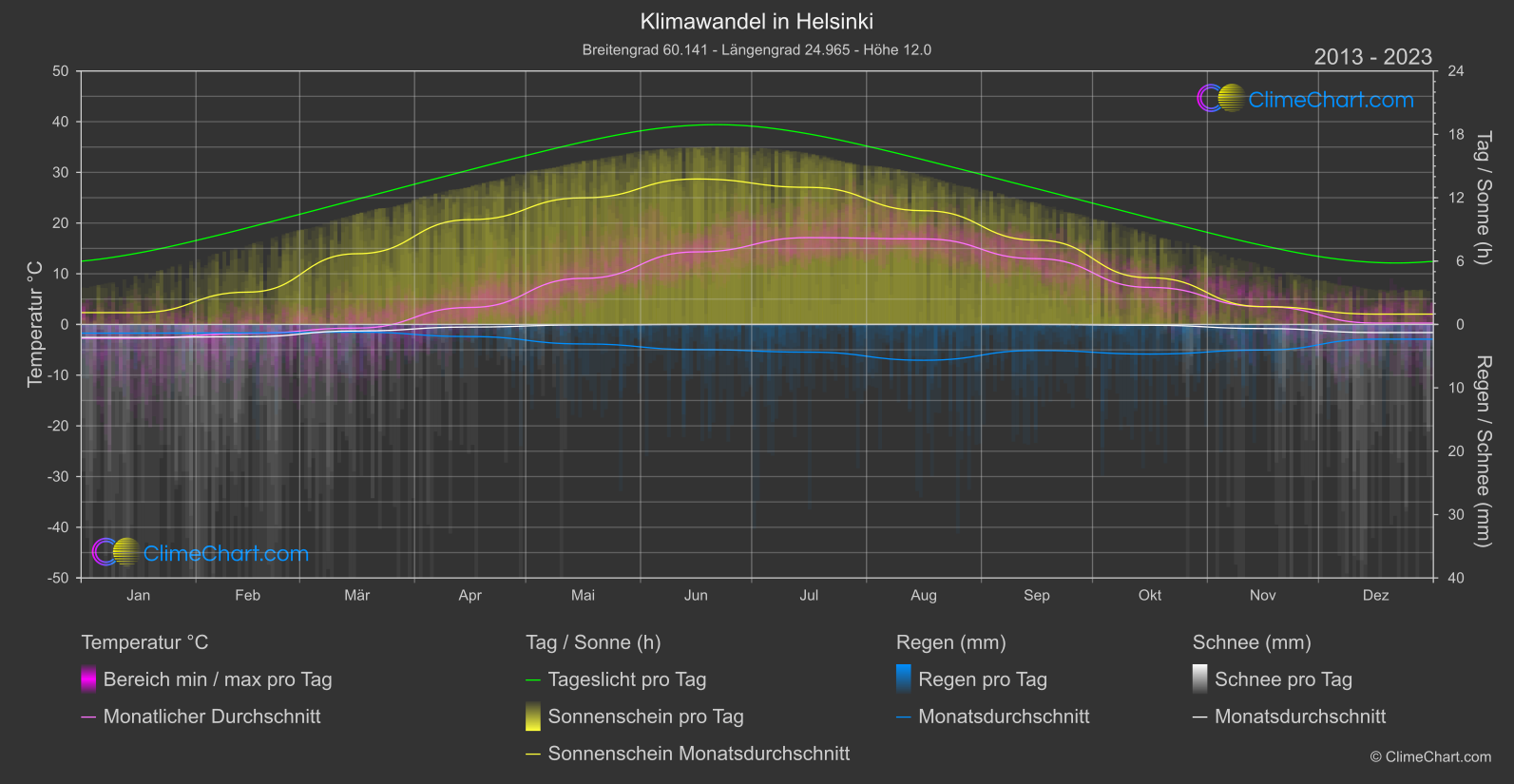 Umfassendes Klimawandel-Diagramm von Helsinki, Finnland: Monatliche Durchschnitte und Auswirkungen