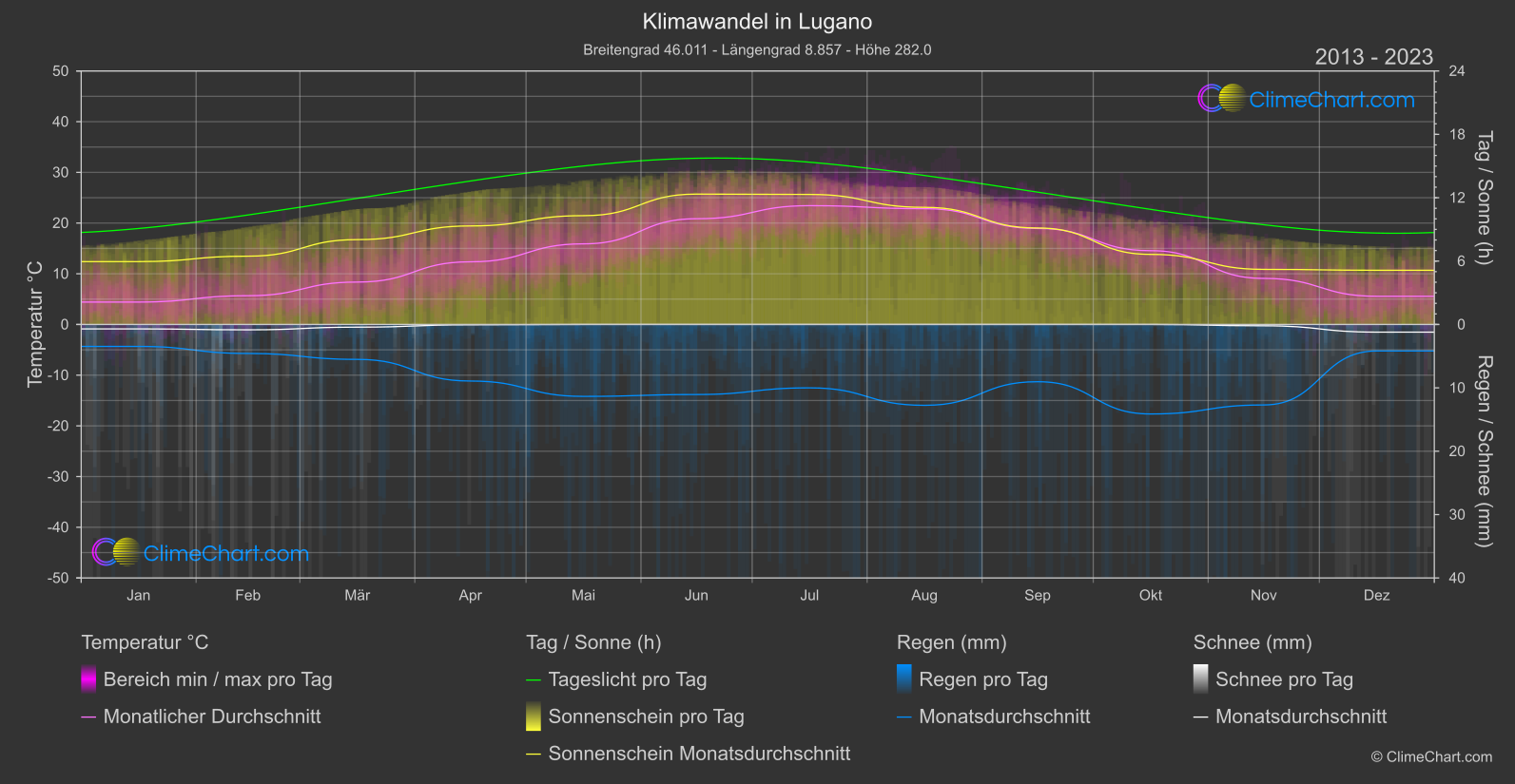 Umfassendes Klimawandel-Diagramm von Lugano, Schweiz: Monatliche Durchschnitte und Auswirkungen