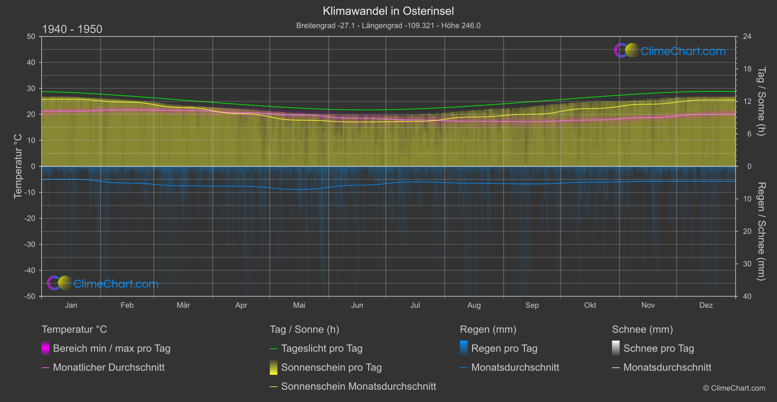 Umfassendes Klimawandel-Diagramm von Osterinsel, Chile: Monatliche Durchschnitte und Auswirkungen