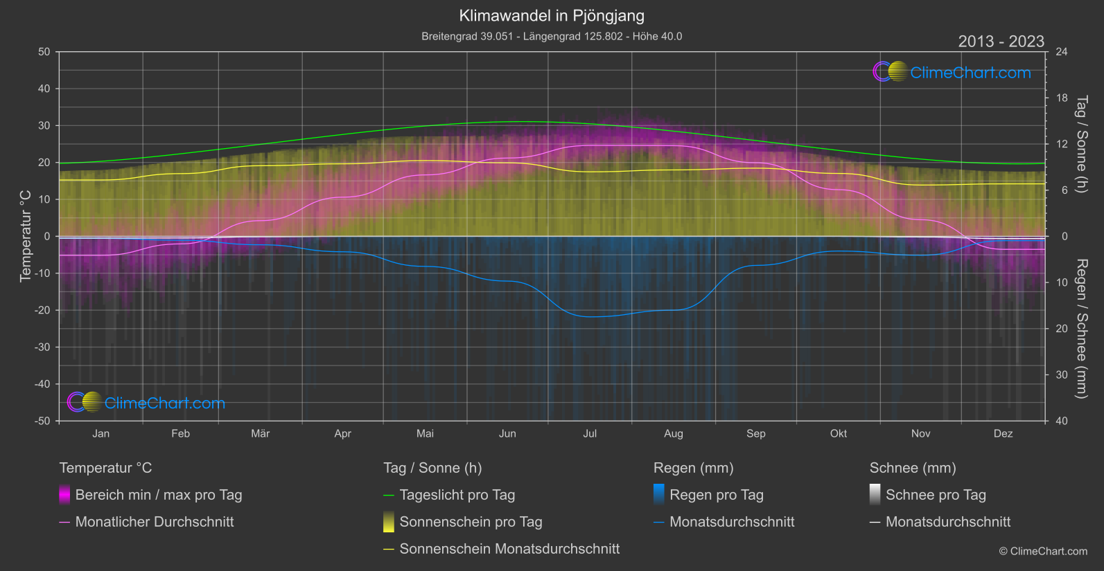 Umfassendes Klimawandel-Diagramm von Pjöngjang, Nord Korea: Monatliche Durchschnitte und Auswirkungen