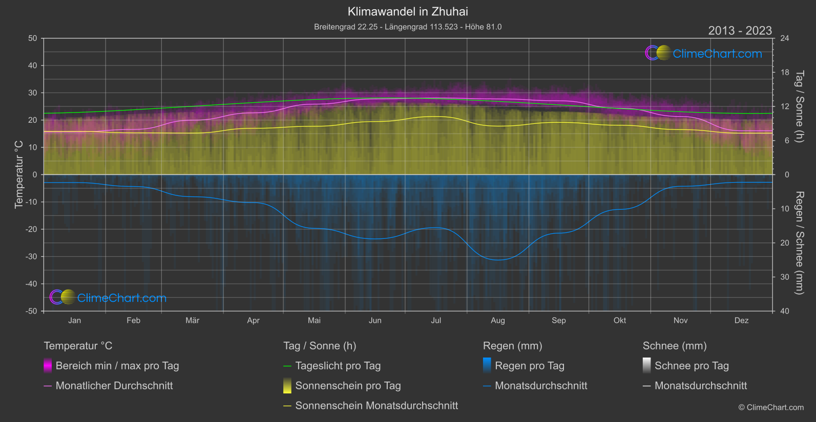 Umfassendes Klimawandel-Diagramm von Zhuhai, China: Monatliche Durchschnitte und Auswirkungen
