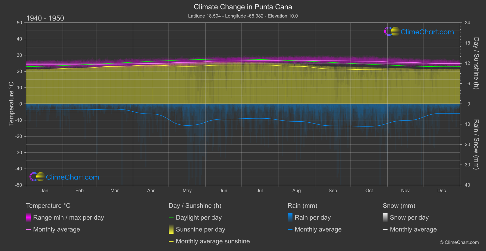 Explore the changing climate in Punta Cana, Dominican Republic with insights from temperature, rainfall, and sunshine duration data. Discover how the climate has evolved over the years.