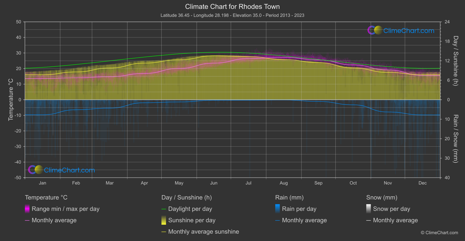 Rhodes, Greece boasts a Mediterranean climate with hot, dry summers and mild, wet winters.