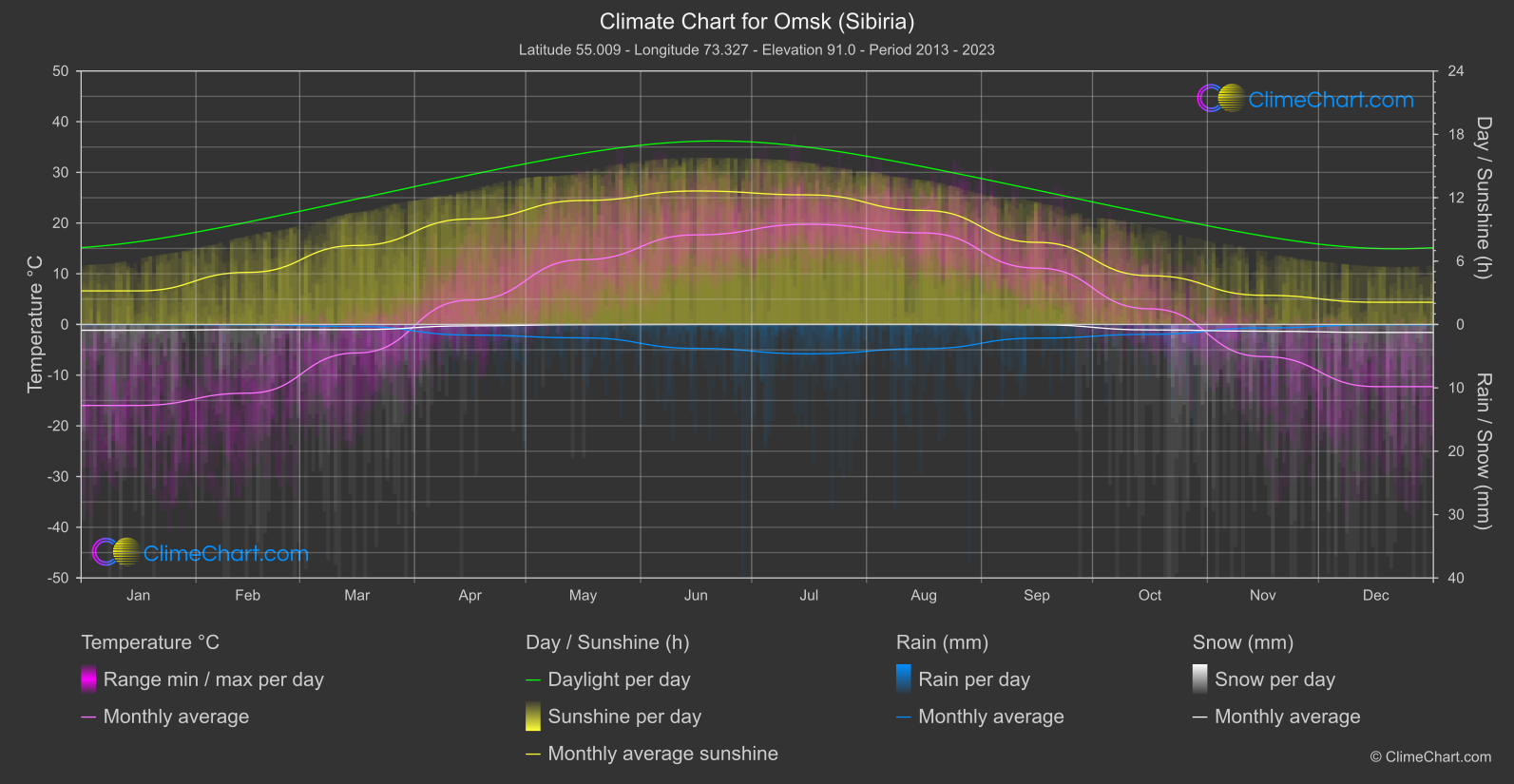 Omsk in Siberia, Russian Federation, experiences a continental climate with harsh winters and warm summers.
