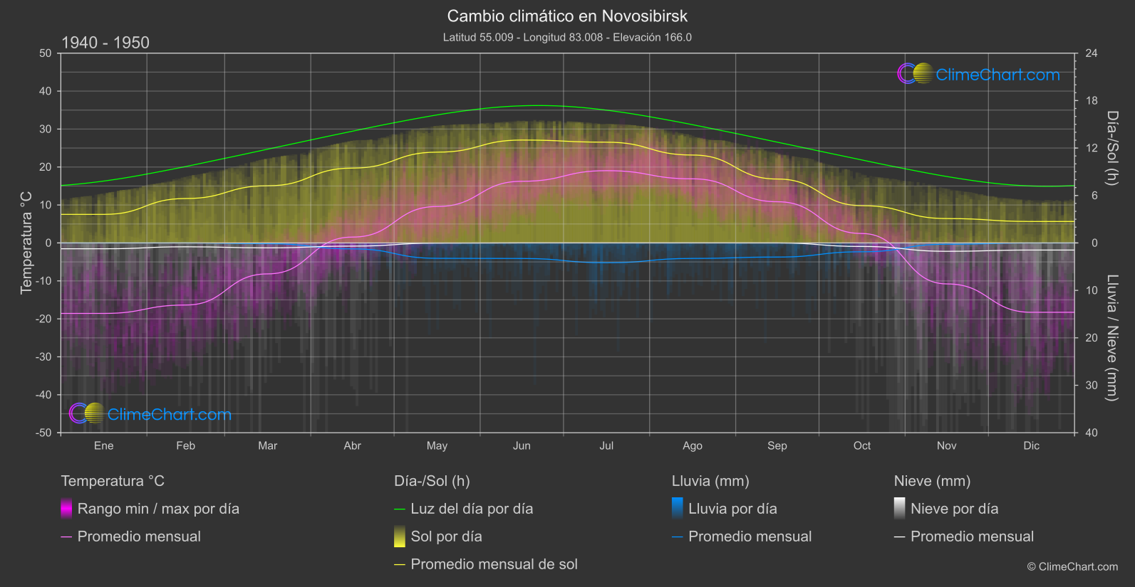 Explorar el cambio climático en Novosibirsk, Federación Rusa, revela cambios significativos en la temperatura, precipitaciones, nevadas y duración de la luz solar a lo largo de los años.