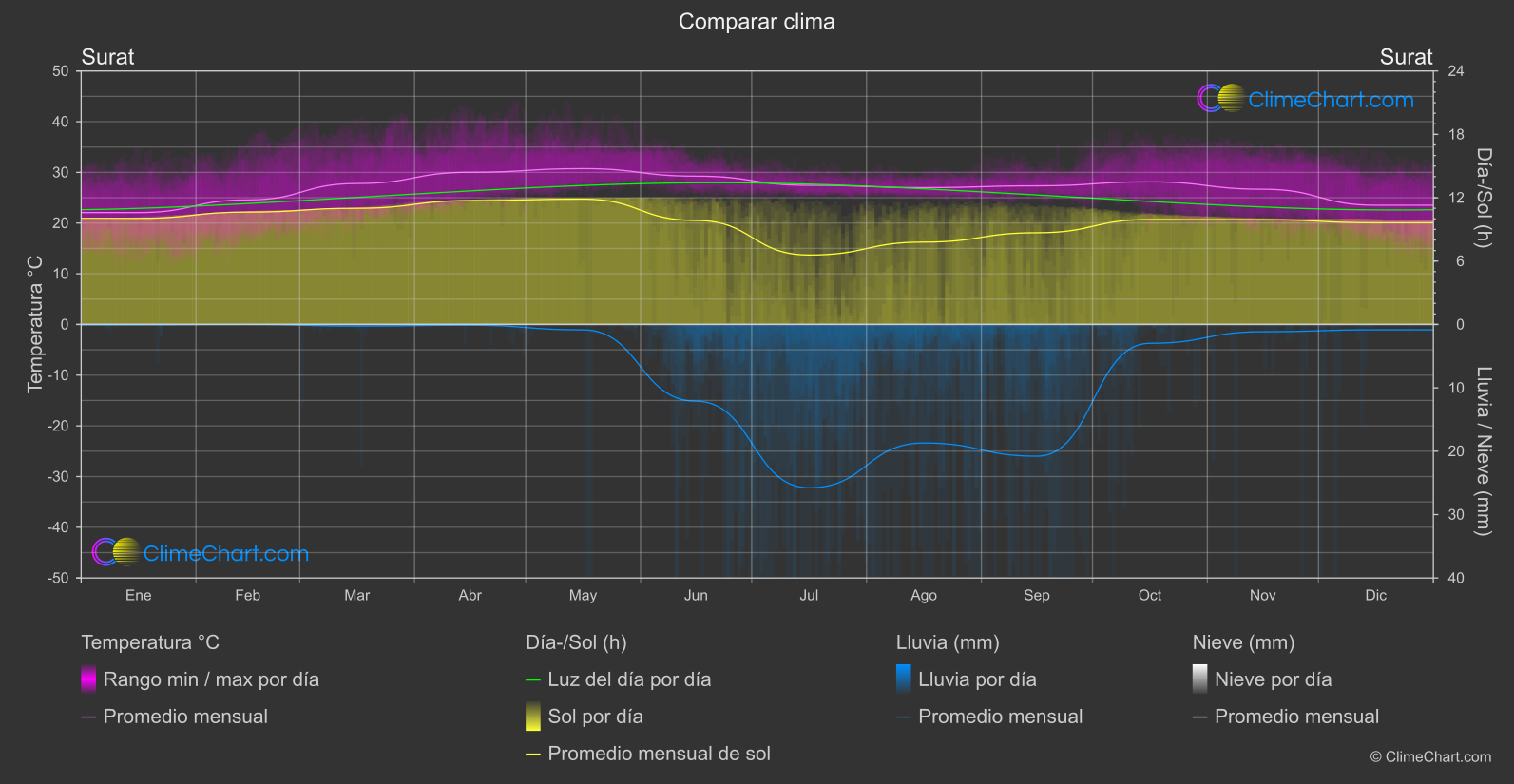 Resumen de Datos de Comparación Climática para Surat, India vs Llevar a la fuerza, Porcelana