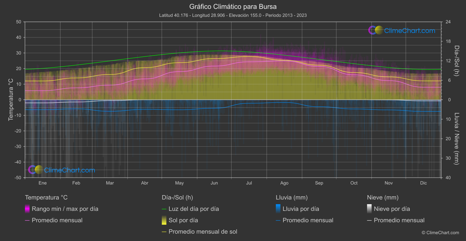 Gráfico Climático Integral de Bursa, Turquía: Promedios Mensuales y Tendencias Climáticas