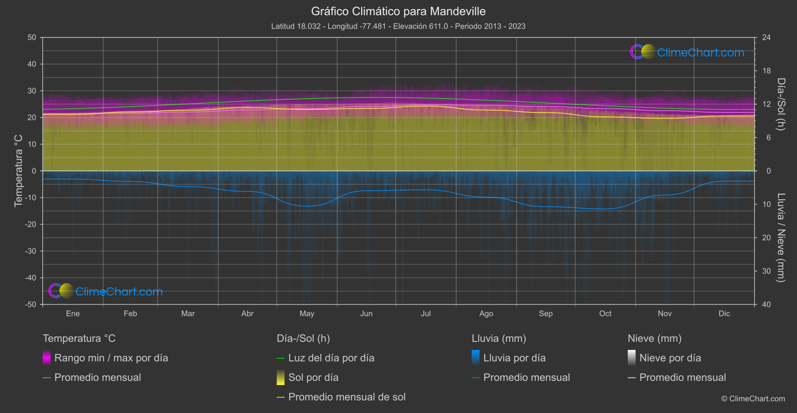 Gráfico Climático Integral de Mandeville, Jamaica: Promedios Mensuales y Tendencias Climáticas