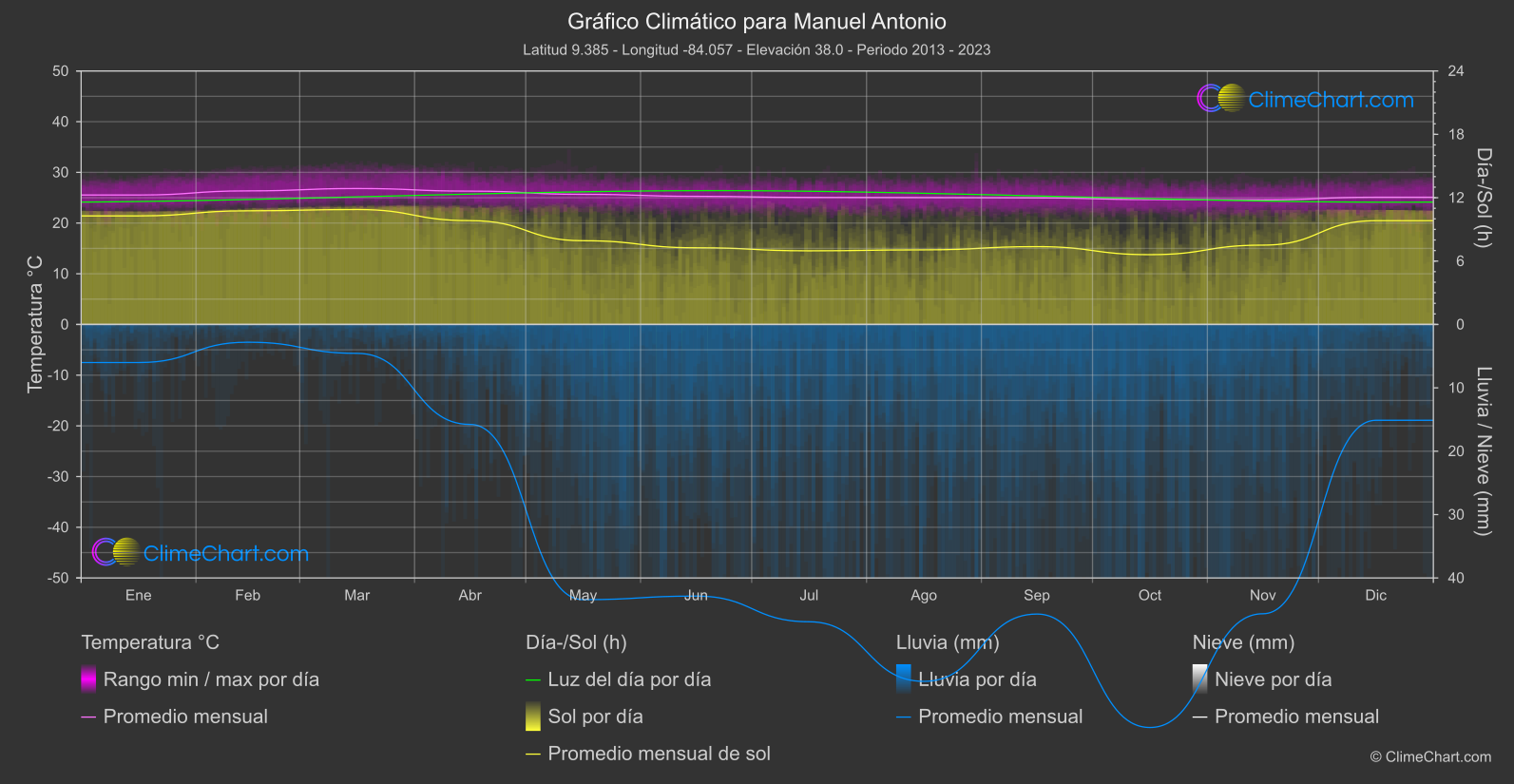 Quepos, ubicado en la costa del Pacífico de Costa Rica, goza de un clima tropical con estaciones húmedas y secas bien definidas.