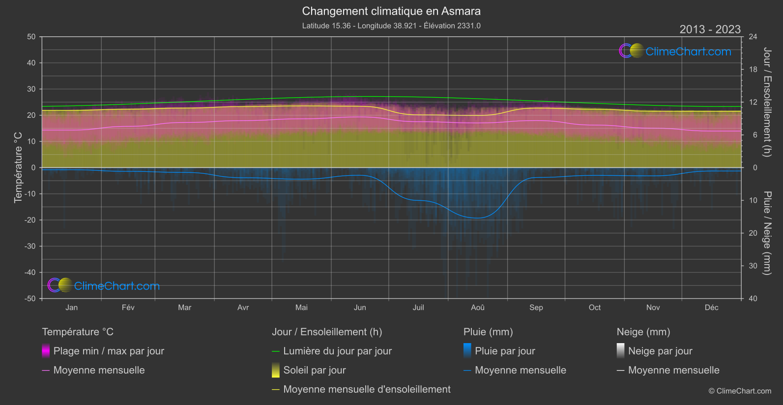 Diagramme Complet du Changement Climatique de Asmara, Érythrée: Moyennes Mensuelles et Tendances d'Impact