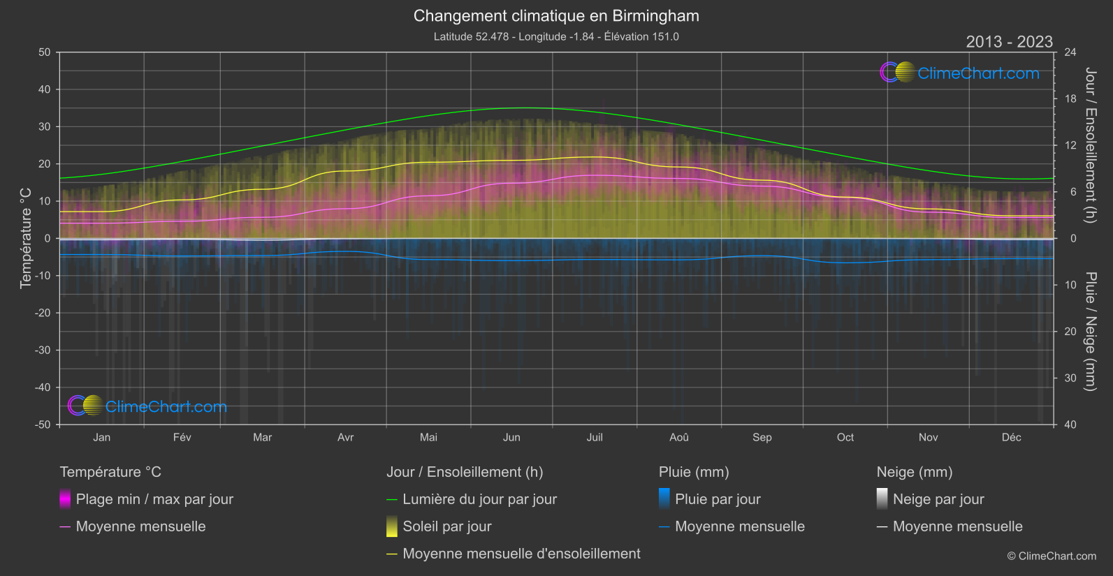 Diagramme Complet du Changement Climatique de Birmingham, Grande-Bretagne: Moyennes Mensuelles et Tendances d'Impact