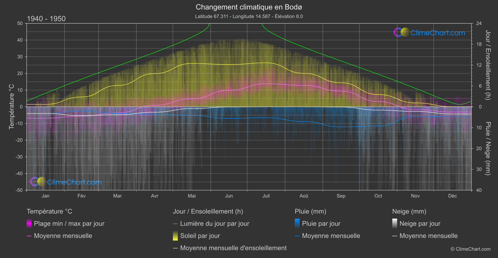 Explorez le changement climatique à Bodø, en Norvège, avec des comparaisons de données informatives de 1940-1950 à 2013-2024.