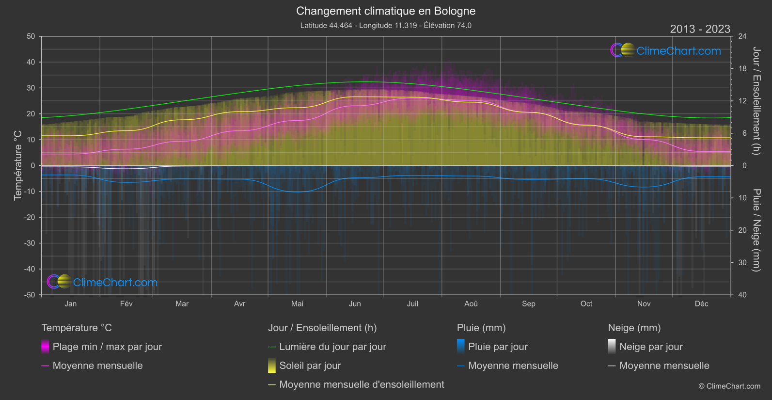 Diagramme Complet du Changement Climatique de Bologne, Italie: Moyennes Mensuelles et Tendances d'Impact