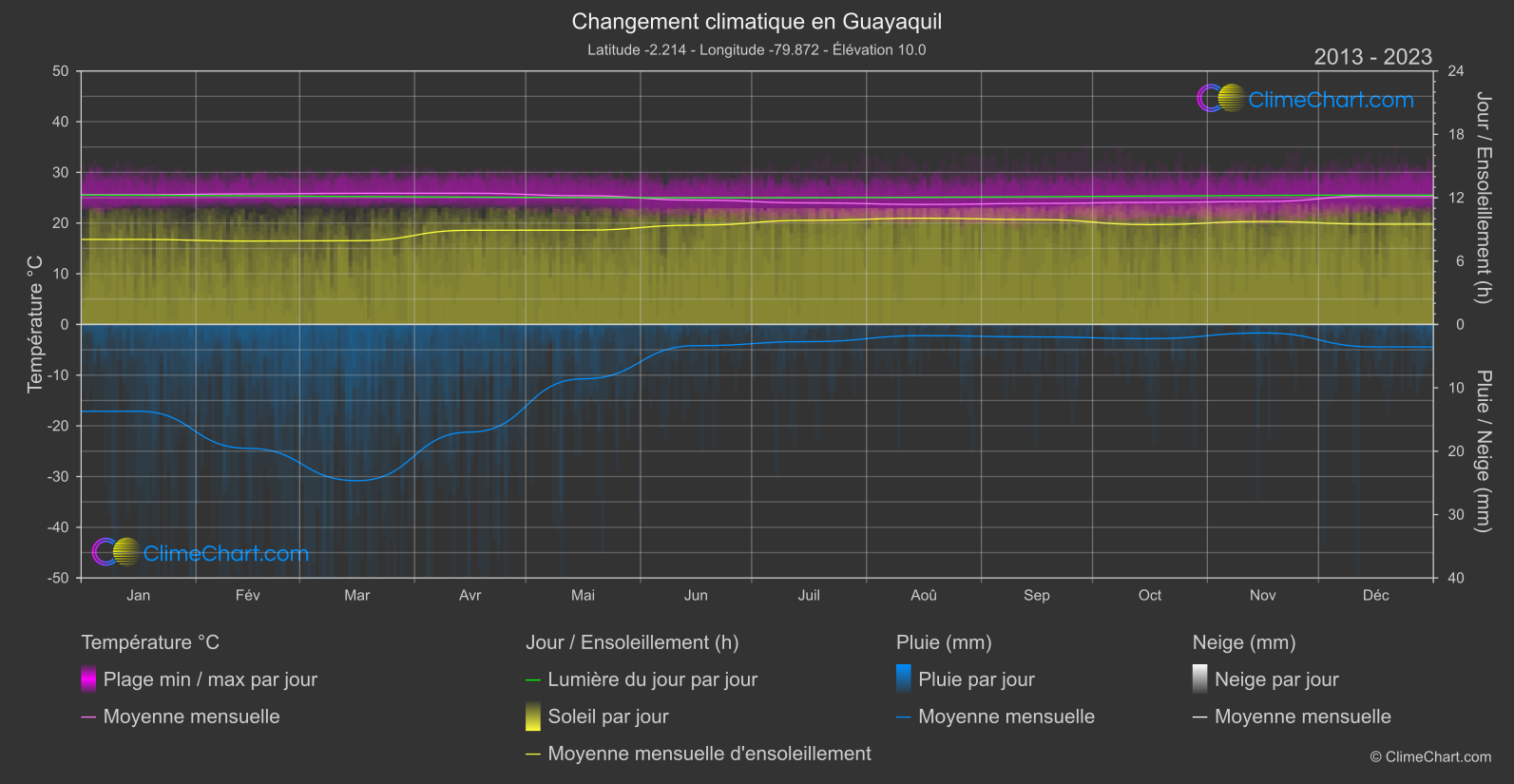 Diagramme Complet du Changement Climatique de Guayaquil, Équateur: Moyennes Mensuelles et Tendances d'Impact