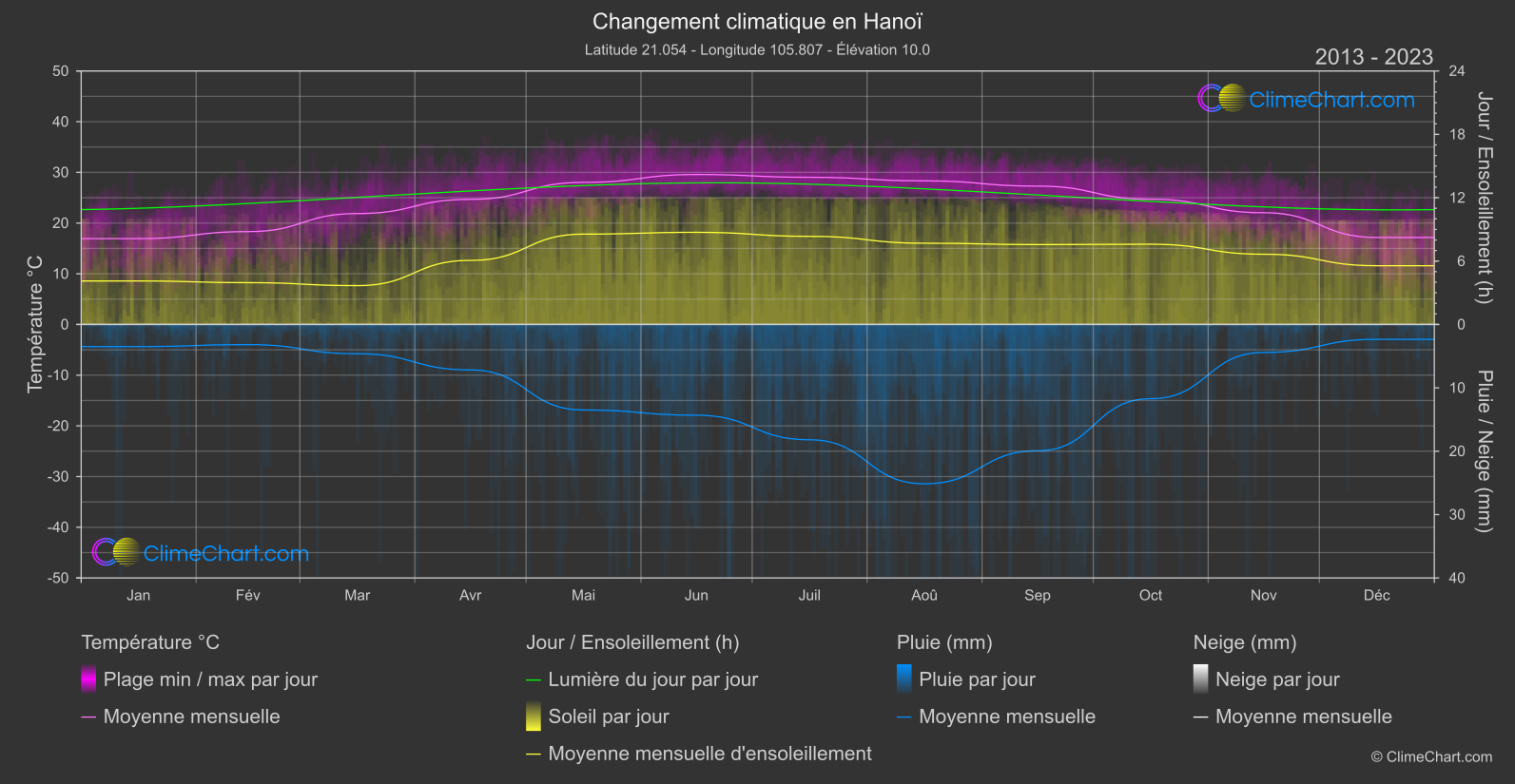 Explorez les données complètes sur le changement climatique pour Hanoï, Viet Nam. Ce tableau détaillé fournit des informations précieuses sur les variations de température, les niveaux de précipitations et les changements saisonniers influencés par le changement climatique, vous aidant à comprendre les conditions météorologiques uniques de cette région.