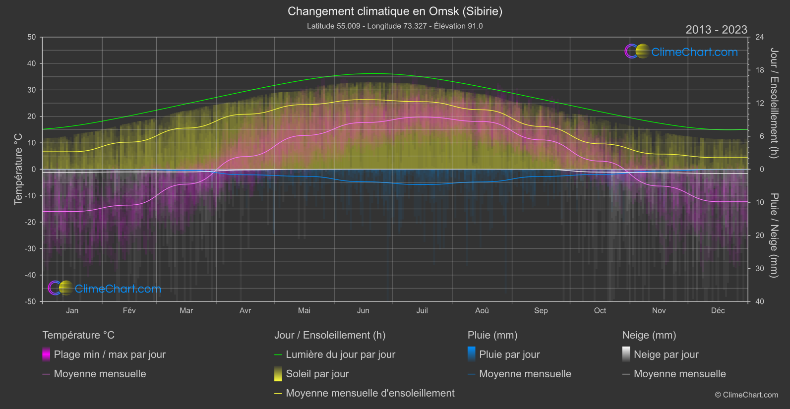 Découvrez les données sur le changement climatique pour Omsk, Sibérie, Fédération de Russie, en comparant les températures, les précipitations, les chutes de neige et la durée d'ensoleillement entre 1940-1950 et 2013-2024.