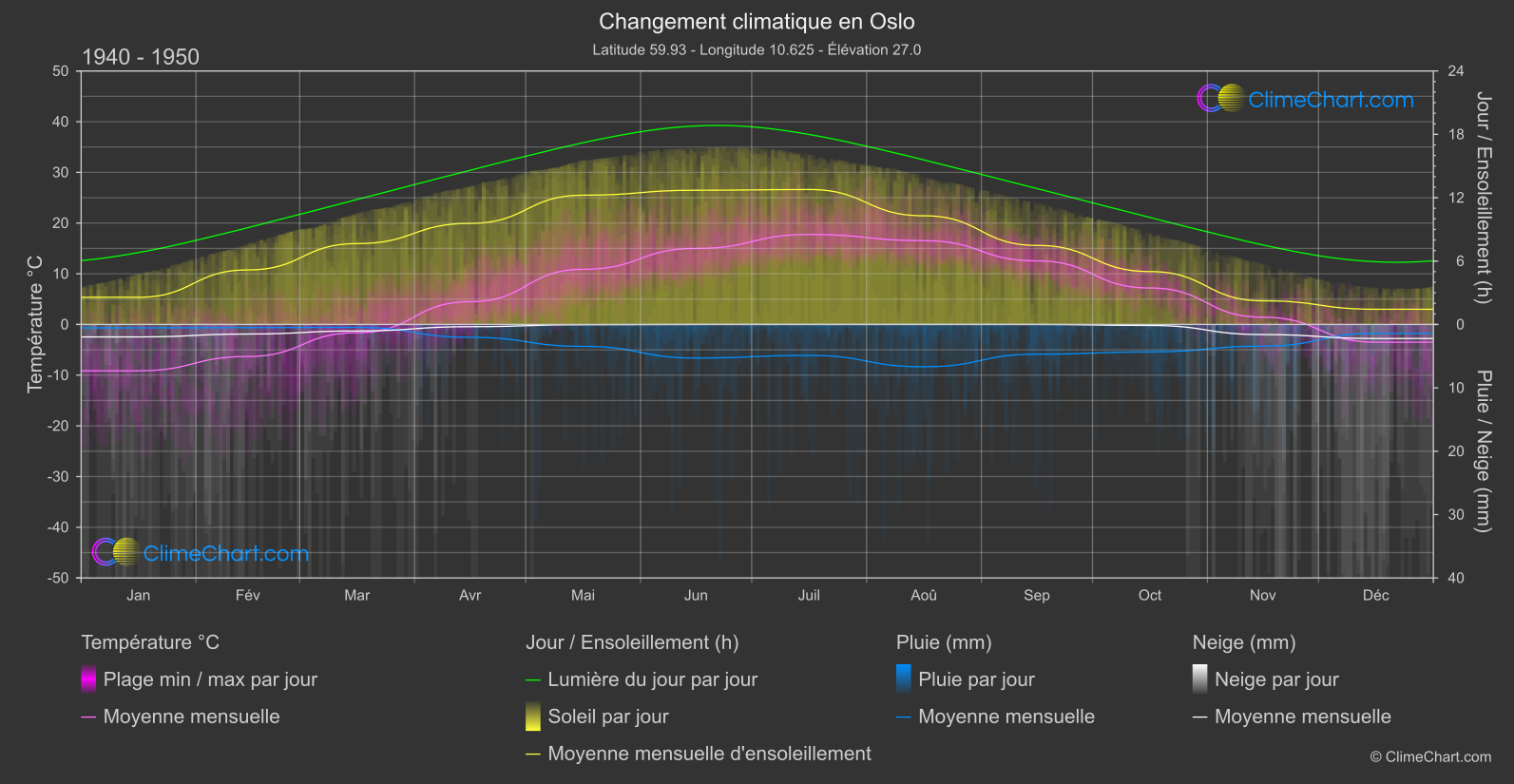 Diagramme Complet du Changement Climatique de Oslo, Norvège: Moyennes Mensuelles et Tendances d'Impact