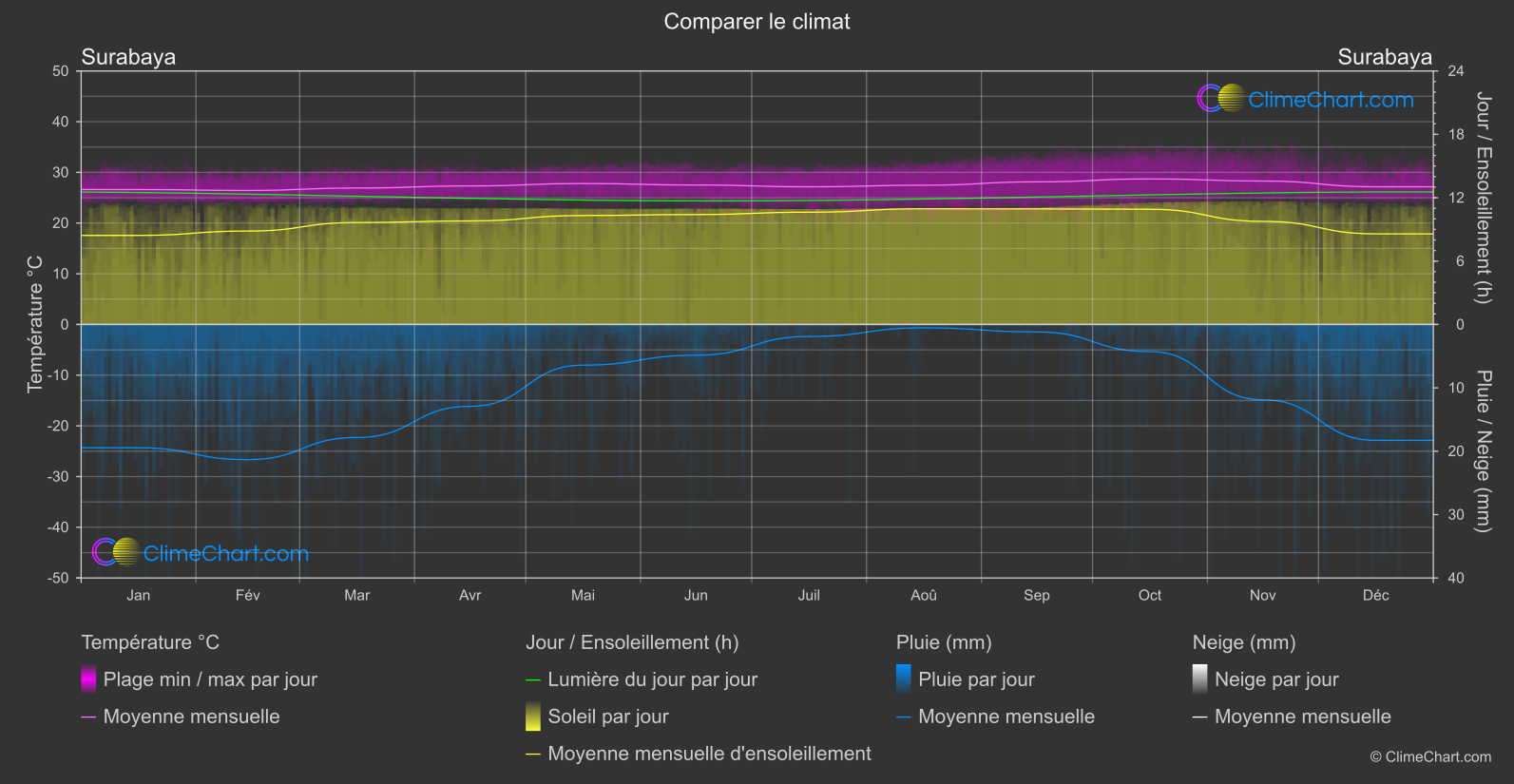 Explorez les données complètes de comparaison climatique pour Surabaya, Indonésie et Mexico, Mexique. Ce tableau détaillé fournit des informations précieuses sur les variations de température, les niveaux de précipitations et les changements saisonniers influencés par les facteurs climatiques, vous aidant à comprendre les conditions météorologiques uniques de ces régions.
