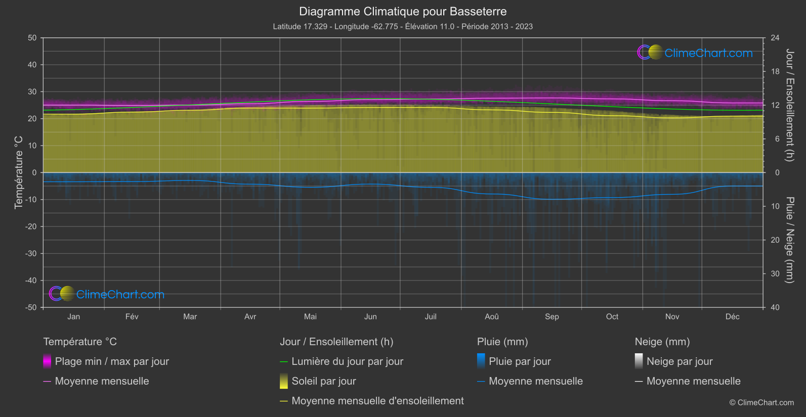 Diagramme Climatique Complet de Basseterre, Saint-Christophe-et-Niévès: Moyennes Mensuelles et Tendances Météorologiques
