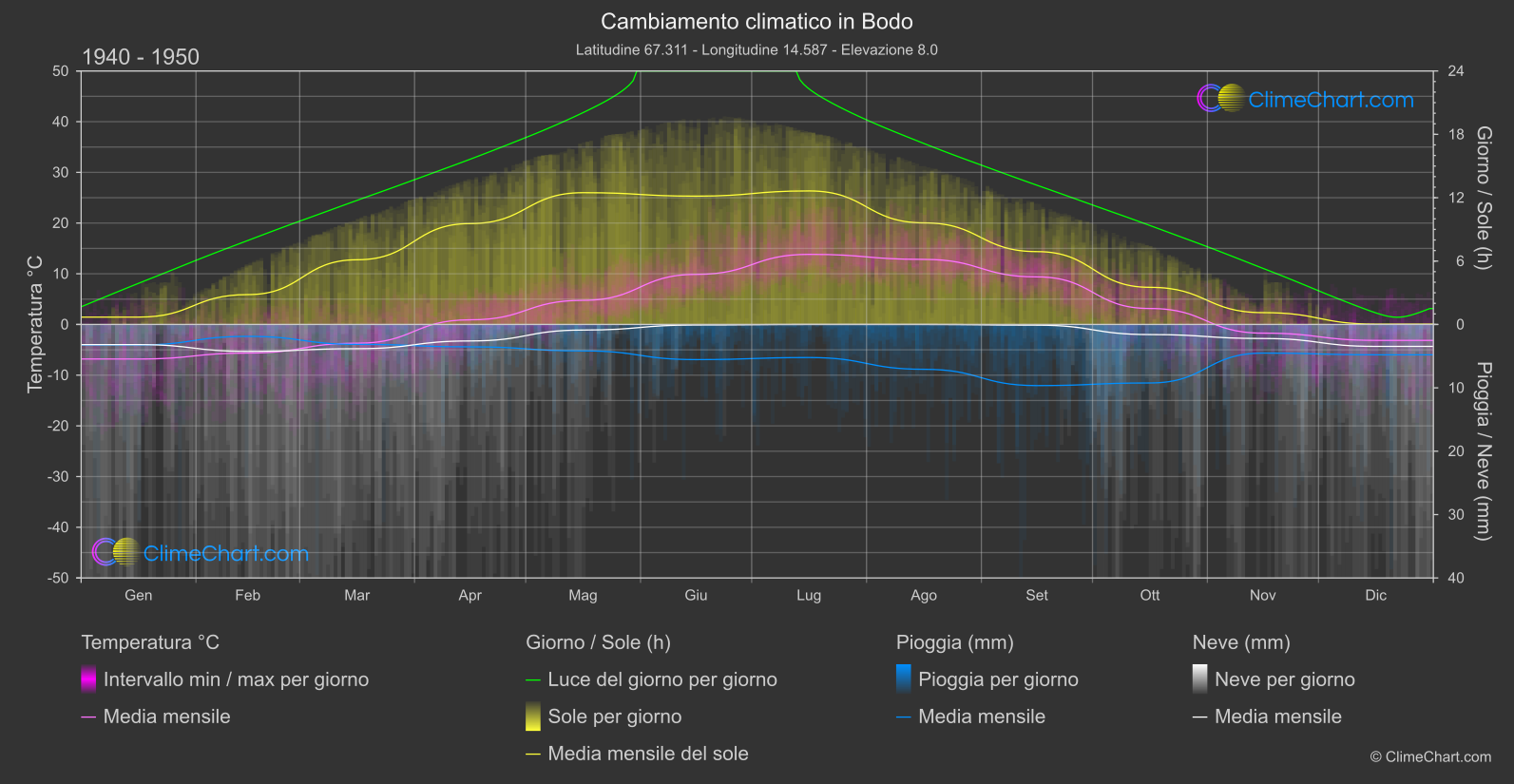 Grafico Completo del Cambiamento Climatico di Bodo, Norvegia: Medie Mensili e Tendenze di Impatto