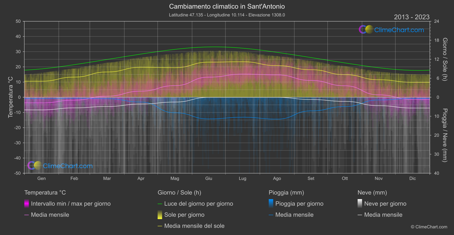 Grafico Completo del Cambiamento Climatico di Sant'Antonio, Austria: Medie Mensili e Tendenze di Impatto