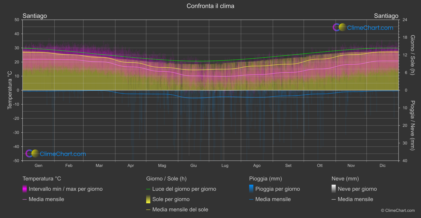 Grafico di Confronto Climatico di Santiago, Chile vs Évora, Portogallo