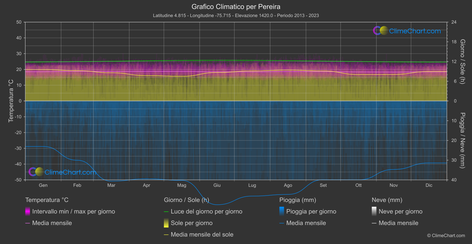 Pereira, situata nella regione del Triangolo del Caffè in Colombia, gode di un clima di montagna subtropicale piacevole con temperature costanti durante tutto l'anno.