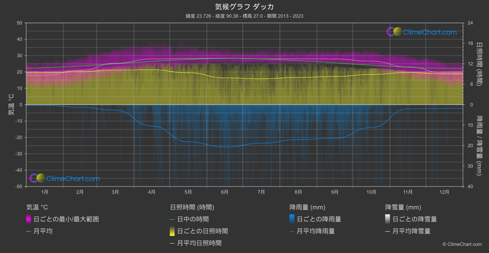 ダッカ, バングラデシュ包括的な気候チャート: 月ごとの平均値と気象傾向