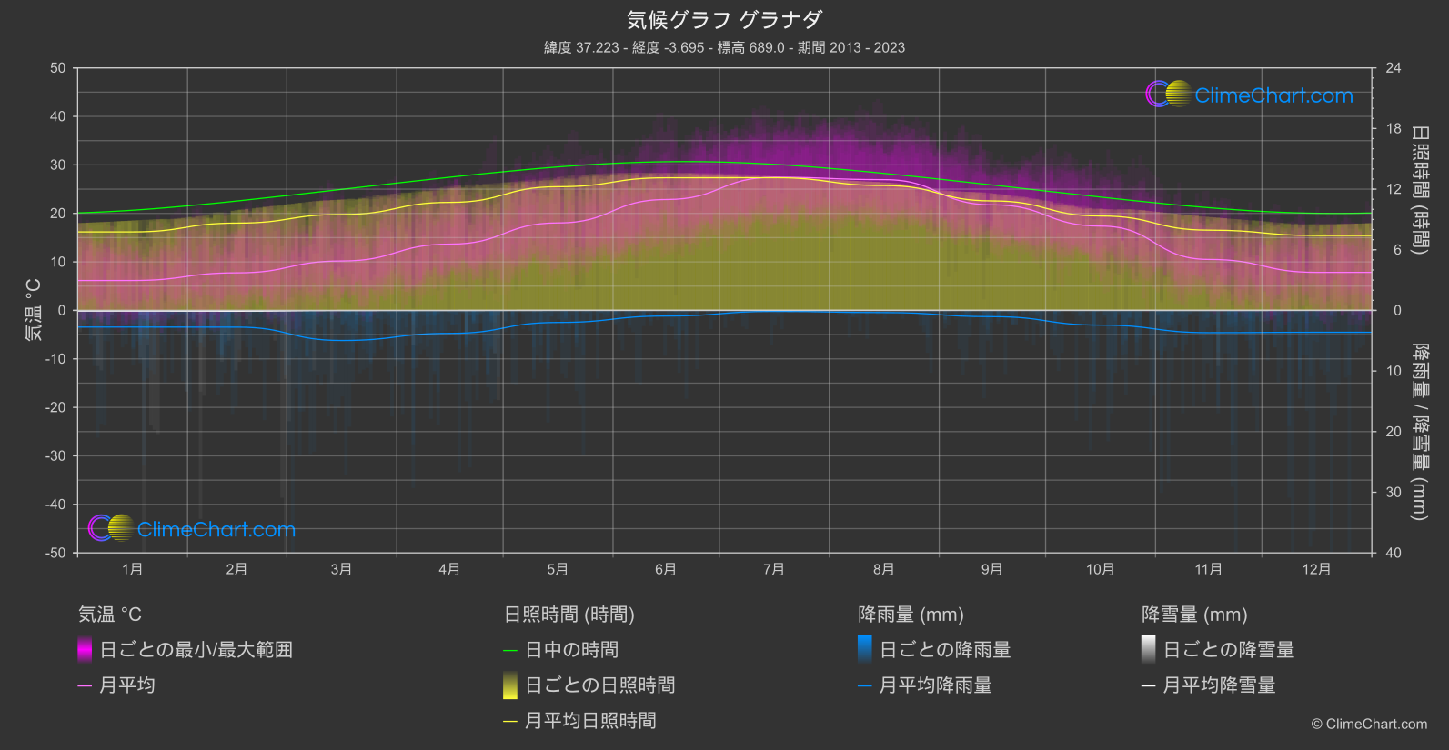 グラナダ, スペイン包括的な気候チャート: 月ごとの平均値と気象傾向