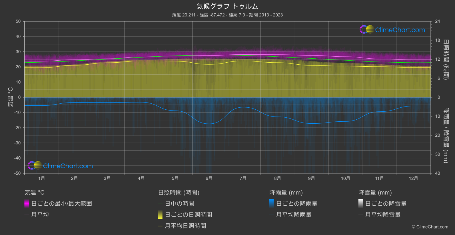 トゥルム, メキシコ包括的な気候チャート: 月ごとの平均値と気象傾向