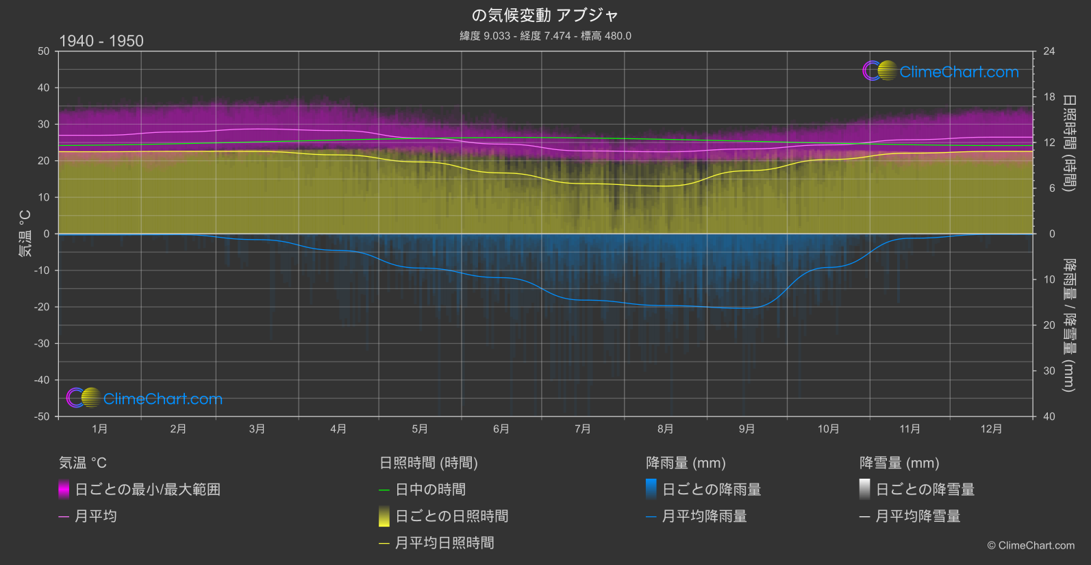 アブジャ, ナイジェリアの包括的な気候変動チャート: 月ごとの平均値と影響の傾向