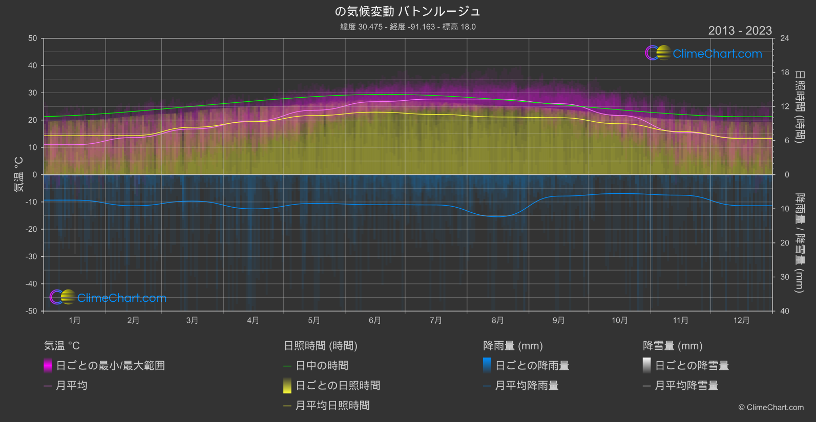 バトンルージュ、アメリカの気候変動トレンドを発見し、気温、降水量、降雪量、日照時間に関する情報を紹介します。