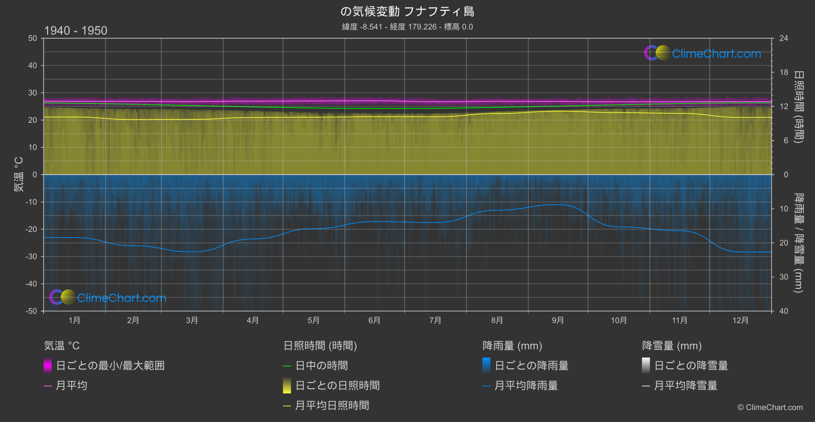 フナフティ島, ツバルの包括的な気候変動チャート: 月ごとの平均値と影響の傾向