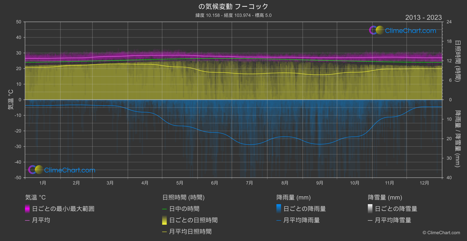 フーコック島、ベトナムの気候変動を、気温、降水量、日照時間に関する詳細なインサイトを通じて探索してください。何年にわたって気候が変化してきたか、この美しい島に与える影響を発見してください。