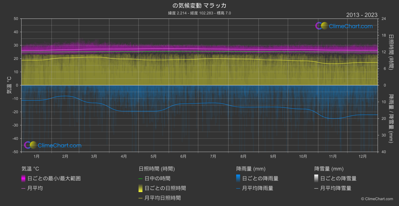 マレーシアのマラッカの気候変動に関する気温、降水量、日照時間データから得られる洞察をご紹介します。