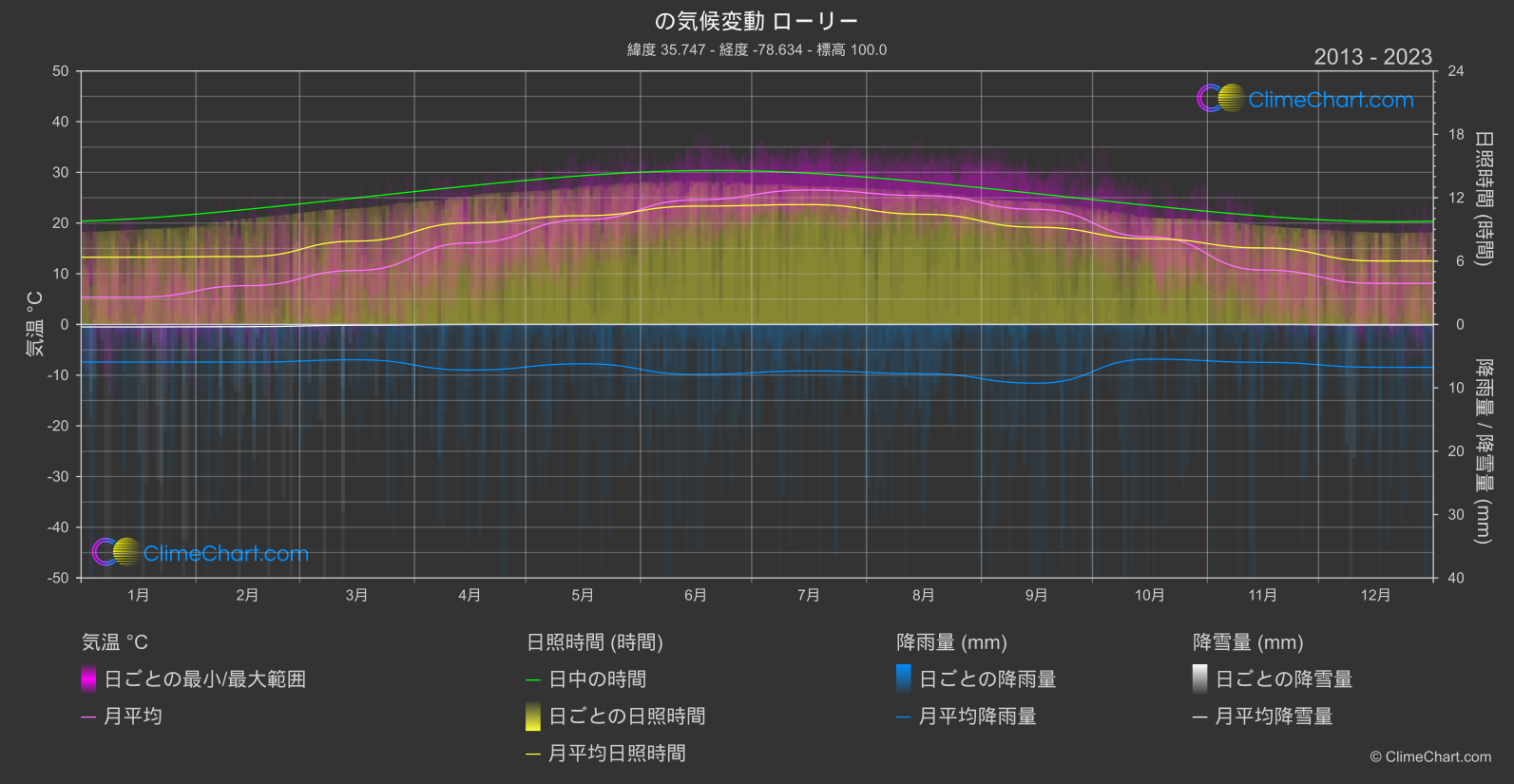 ローリー, アメリカ合衆国の包括的な気候変動チャート: 月ごとの平均値と影響の傾向