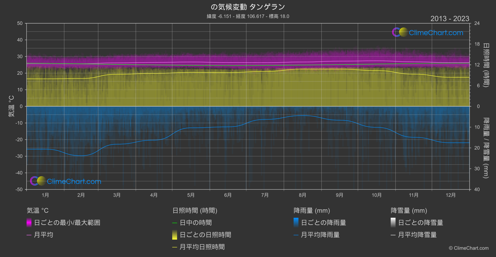 タンゲラン, インドネシアの包括的な気候変動チャート: 月ごとの平均値と影響の傾向